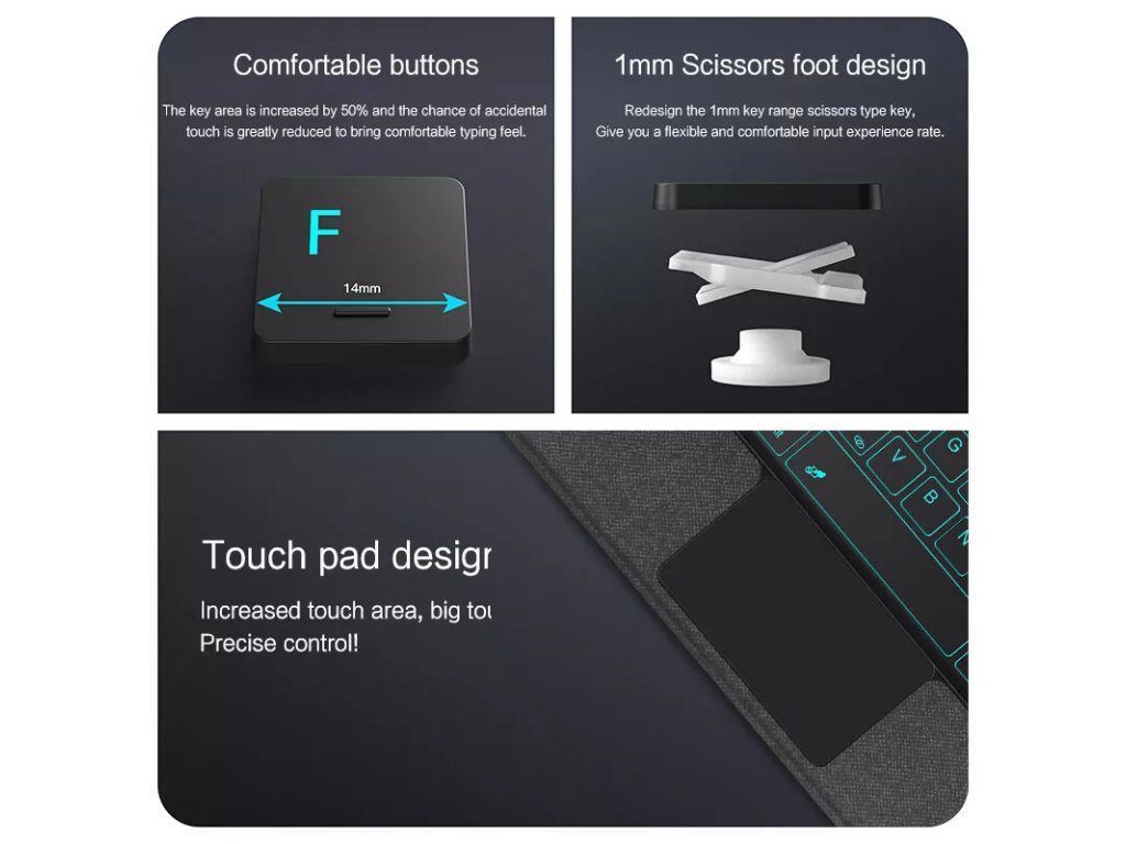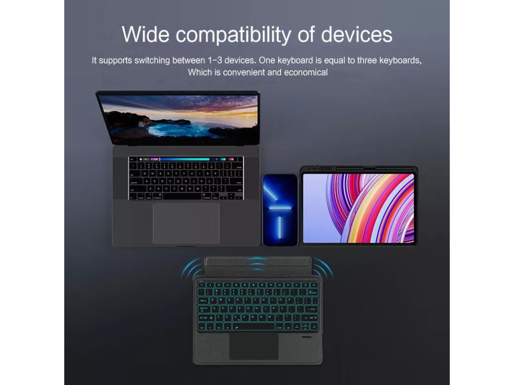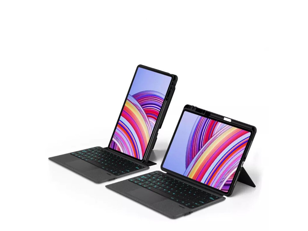 Pouzdro je vybaveno auto-wake/sleep funkcí, která šetří baterii vašeho tabletu a zajišťuje okamžitý přístup k vašemu zařízení. Odnímatelná klávesnice s podsvícením a chytrým trackpadem vám umožňuje pracovat efektivně i v nízkých světelných podmínkách. Nastavitelný stojánek a magnetické uchycení klávesnice zajišťují stabilní polohu pro psaní a sledování obsahu, ať už jste doma, v kanceláři nebo na cestách.